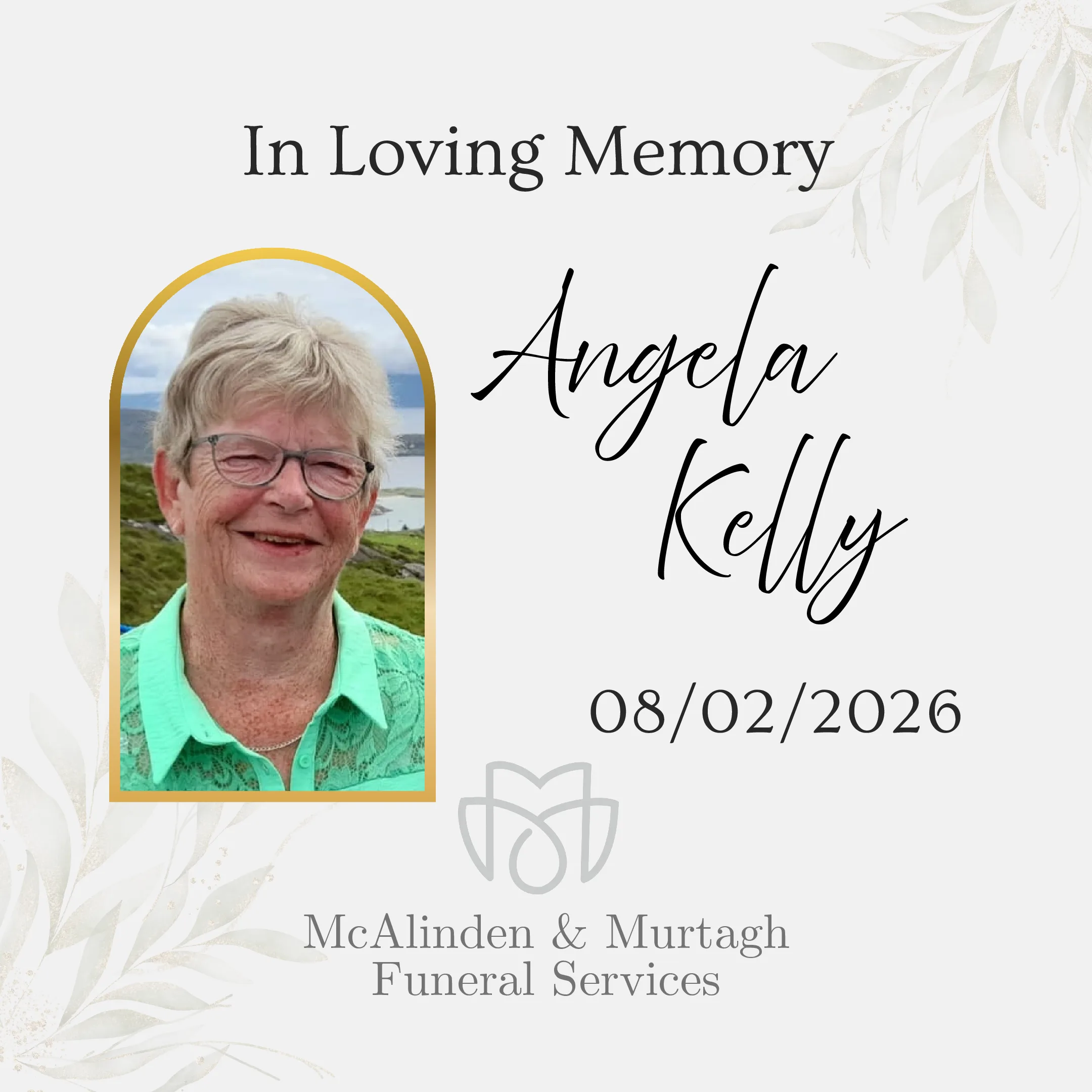 Kelly (née O’Neill), (Aghagallon), February 8, 2026, peacefully at the Royal Victoria Hospital, Belfast, surrounded by her loving family. Angela, beloved wife of Colm and a dearly loved mother of Catherine, loving daughter of the late Henry and Mary O’Neill (Loughview Terrace , Derrytrasna), and a dear sister of Oliver, Eamon and the late Hugh, […]