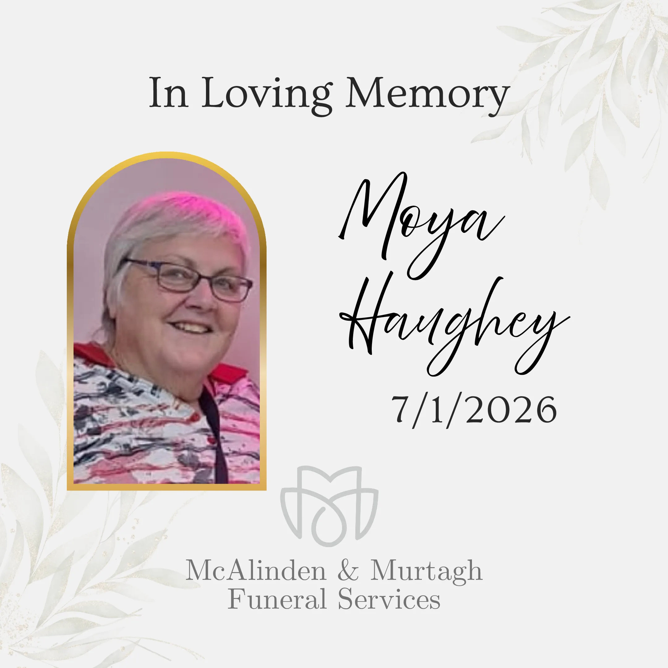 Haughey (Lurgan), January 7, 2026 peacefully at Craigavon Area Hospital surrounded by her loving family. Moya, beloved daughter of the late Annie and Conal Haughey (Allenhill Park), and loving sister of Martin, Margie, Brian, Philip and Noel. Dear sister-in-law of Noel, Kate, Janet, Pauline and Clare, a caring niece to Maura and the late Isobel, […]