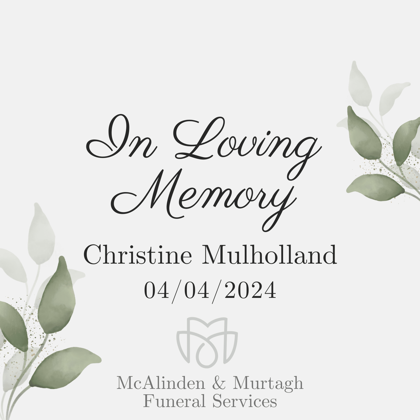 Mulholland (Clonmeen, Craigavon), April 4, 2024 peacefully at Craigavon Area Hospital. Christine, a cherished mother of Jordan and beloved daughter of the late Kathleen and John Mulholland, loving sister of Angela, Joan, Rita and Stephen, a dear sister in law and much loved aunt. Christine will repose at McAlinden and Murtagh Funeral Home, 43 Ardmore […]