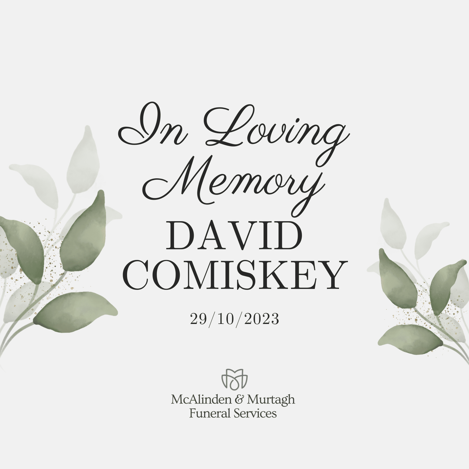 Comiskey, (Derry, formerly of Lurgan), October 29, 2023, unexpectedly at home. David, son of Tony and the late Marie (McAvoy) and stepson of the late Joseph McAvoy, a much loved brother of Elaine, Shelleen and Michael, he will will always be loved by his nieces and nephews. David will repose at his sister Shelleen’s home […]