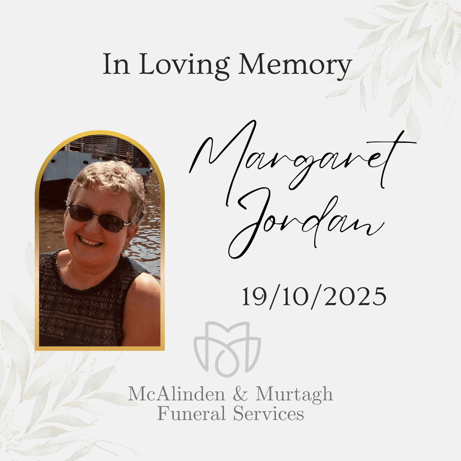 Margaret Jordan (nee Carville) (95 Belvedere Manor, Lurgan), October 19, 2025 peacefully at home surrounded by her loving family. Margaret, beloved wife of Kieran, loving mother of Rory, Cara and Áine, and a dear mother-in-law to Laureen, Sean and Tony. A devoted granny to Olivia, Charlie, Elliot and Joe. Beloved daughter of the late Bobby […]