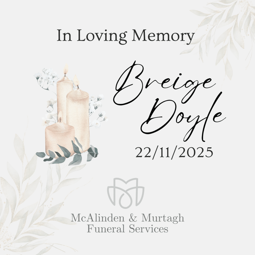 Breige, dearly beloved wife of Jim, a much-loved mother of Carrie (Niall), James (Clara) and Jack, and the late Niamh and Eimear (who died in infancy), and cherished grandmother of Sheá (Natalie), Aifé and Faolán.