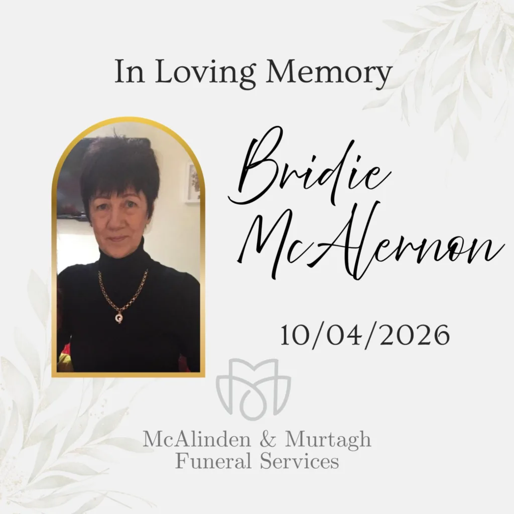 Funeral from her daughter’s residence, 55 Belvedere Manor, Lurgan, BT67 9NN today Tuesday at 9.15am to St. Peter’s Church, Lurgan, where Requiem Mass will be celebrated at 10.00am, followed by burial in St.Colman’s Cemetery.