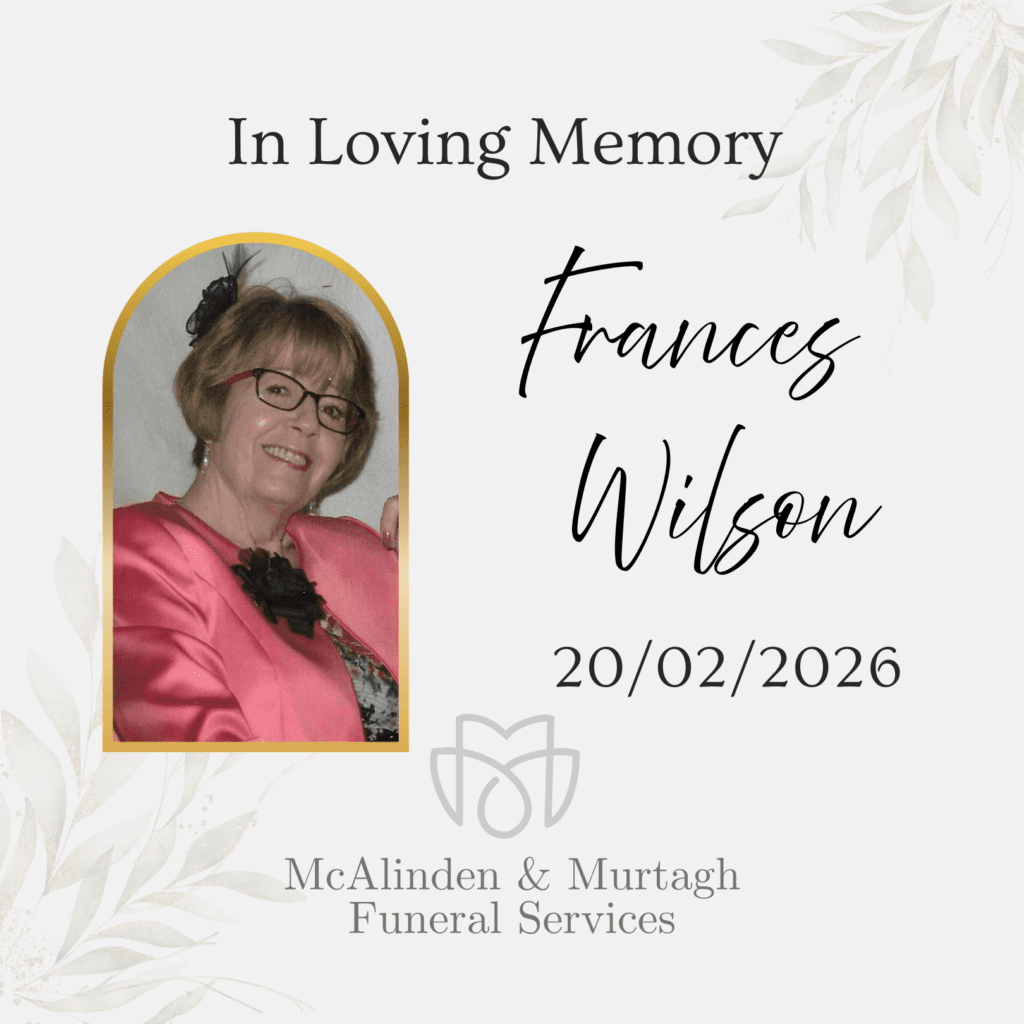 Frances, beloved wife of the late Brian and a devoted mother of Keith, Declan and Allan, cherished mother-in-law of Clare, Aislinn and Rachael, and much-loved grandmother of Áron, Fionn, Eva, Ivy, Enda, Jude and Ella. Loving daughter of the late Margaret and Eddie (Edward) O’Brien, (Aghalee Road, Aghagallon), and a dear sister of Theresa and Margaret and the late Seamus and Sean, sister-in-law of Jim, Peter, Malachy, Eilish, Anne, Josephine and the late Michael.