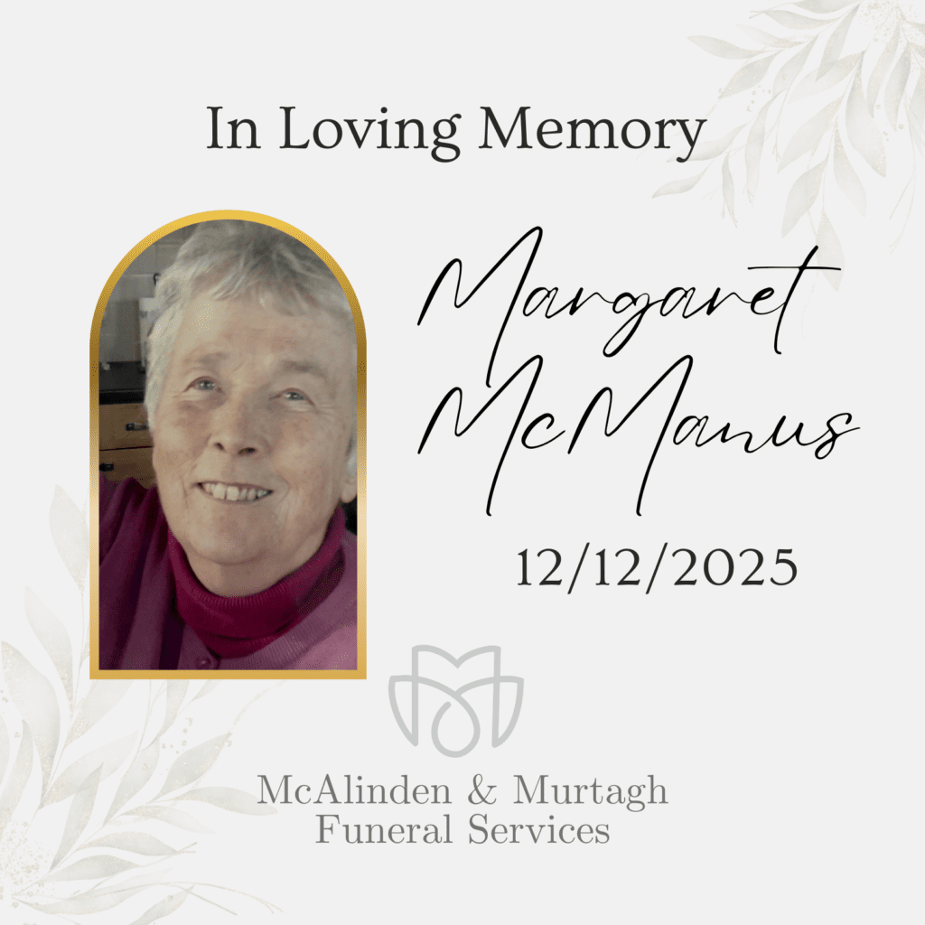 McManus (nee O’Kane), (Aghagallon, formerly of Monea, Co. Fermanagh), December 12, 2025 peacefully at home surrounded by her loving family.