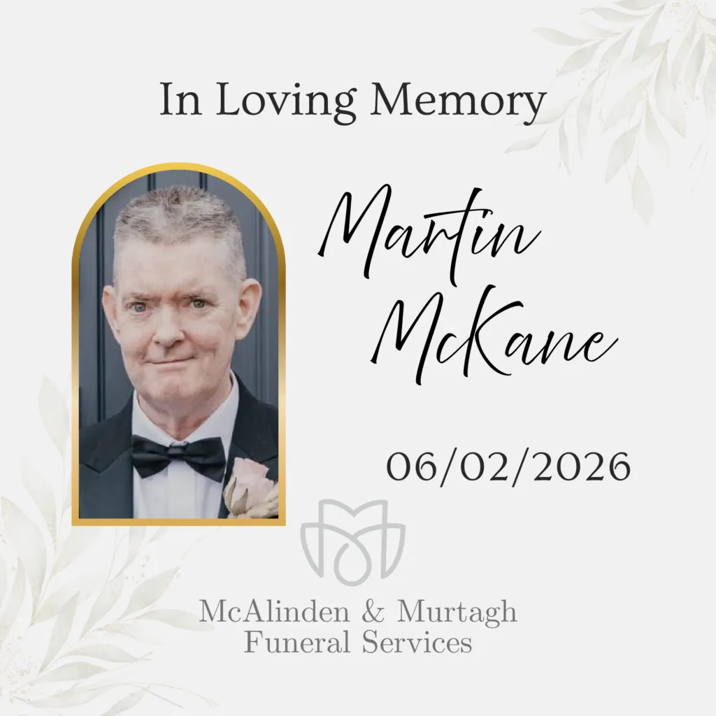 Martin, beloved partner of Joanne, and loving husband of the late Siobhan and a much-loved father of Michael and Eimer, a dear father-in-law to Mise, and a cherished grandfather to Jonnah and Ollie. Dearly loved son of Madeline McKane (Garrymore, Craigavon) and the late Sean (Clonavaddy, Co. Tyrone), a loving brother to Dominic, Una, Heather, Madeline and Jonathan and a much loved brother-in-law and uncle.