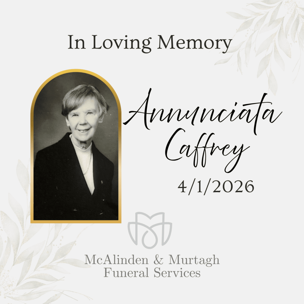 Funeral from the Convent on Wednesday at 9.30 am to St. Paul’s Church, Lurgan for 10.00am Requiem Mass. Burial afterwards in Our Lady’s Acre Cemetery , Longlands Road, Belfast, BT36 7LZ
